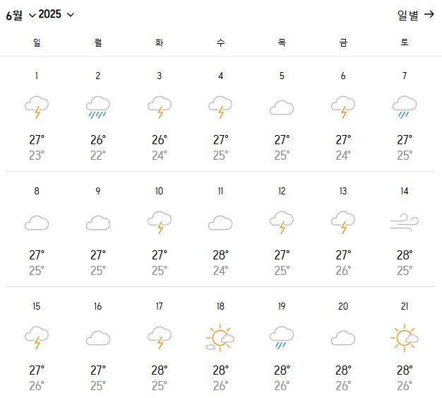 아침과 저녁 최저 기온은 21~23℃로 따뜻하며, 습도도 높아지기 때문에 통풍이 잘 되는 옷차림이 필요합니다.