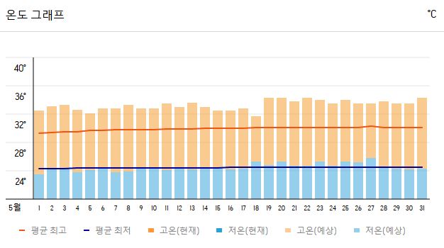 5월은 건기에서 우기로 넘어가는 시기로, 월 평균 강수량은 약 80~100mm로 비교적 적은 편입니다. 대부분은 오후 늦게 짧은 스콜 형태로 비가 내리며, 금세 그치고 맑은 하늘을 되찾습니다.