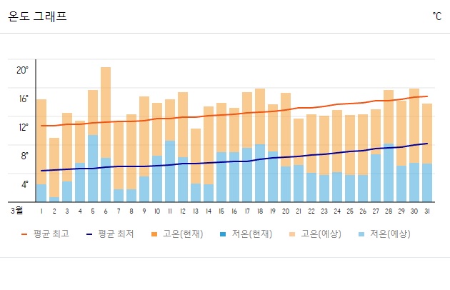 3월은 도쿄가 겨울의 추위에서 봄의 따뜻함으로 전환하면서 상당한 온도 변화를 경험하게 됩니다. 3월 초의 평균 온도는 약 8도에서 12도 (화씨 46도에서 54도) 맴돌고, 월말까지 점차 13도에서 17도 (화씨 55도에서 63도)까지 올라갑니다. 그러나, 도쿄의 날씨는 때때로 추운 날씨이거나 때아닌 따뜻한 날들로 예측할 수 없다는 것을 주목하는 것은 필수적입니다. 3월의 최고 온도는 보통 섭씨 15도에서 20도 (화씨 59도에서 68도)에 이르고, 밤 최저 온도는 섭씨 3도에서 8도 (화씨 37도에서 46도)입니다. 따라서, 방문객들은 다양한 날씨 조건에 대비해야 하고 하루 종일 편안하게 적응하기 위해 겹겹이 옷을 입어야 합니다.