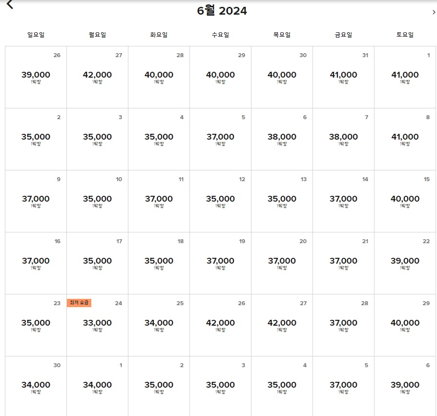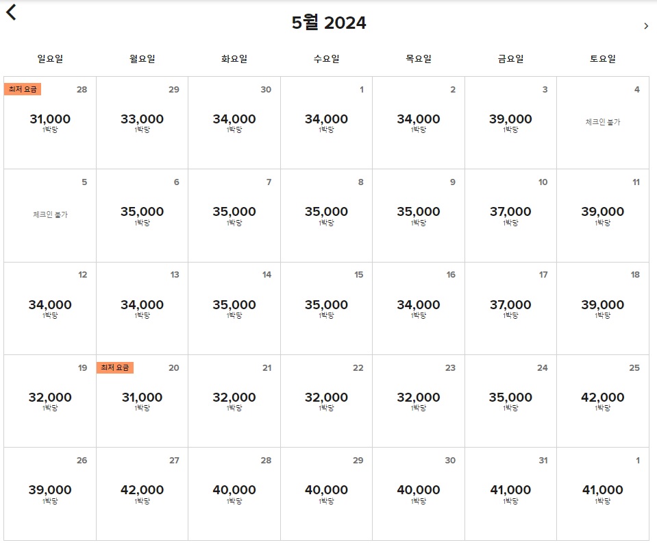 4월부터 6월까지 투숙일별 필요포인트입니다.