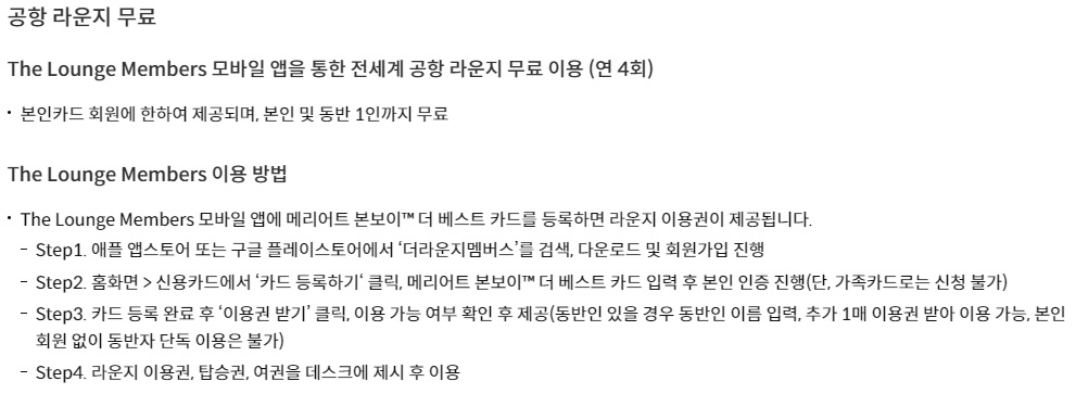 - The Lounge Members 앱을 사용해야 하는데, 깔아 두고 로그인해서 카드만 등록해 두면 됩니다.
