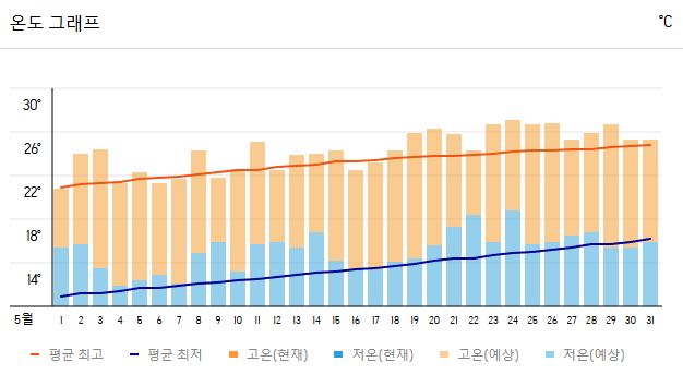 미야코지마 5월 평균 기온은 약 24~25℃로, 초여름답게 따뜻한 날씨가 지속됩니다. 낮 최고 기온은 27~29℃까지 올라 덥게 느껴지는 날도 많습니다.
