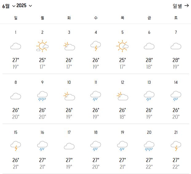 미야코지마 6월의 평균 기온은 26~29℃로 매우 따뜻하며, 본격적인 여름이 시작되는 시기입니다. 낮 최고기온은 30~32℃, 밤 최저기온은 25~26℃로, 일교차가 크지 않고 전반적으로 무더운 날씨가 이어집니다.