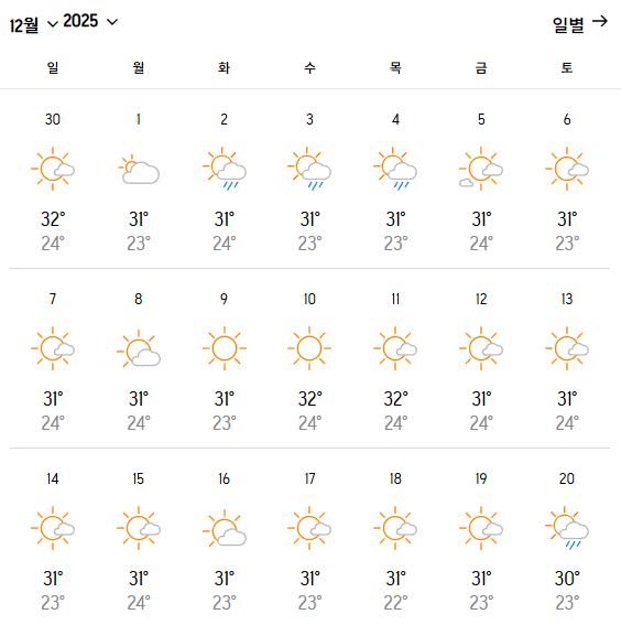 | 평균 낮 최고 | 30~32℃ |