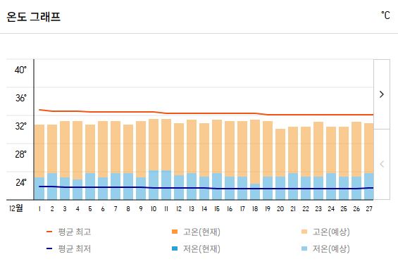 12월의 발리는 연중 평균 기온이 높은 편으로, 낮에는 30~32℃, 밤에는 24~26℃ 수준을 유지합니다. 적도에 가까운 지역이라 일교차가 거의 없으며, 바람이 잦은 해변에서는 체감온도가 조금 낮게 느껴집니다. 하지만 습도가 높아 33~35℃까지 덥게 느껴질 수 있습니다.