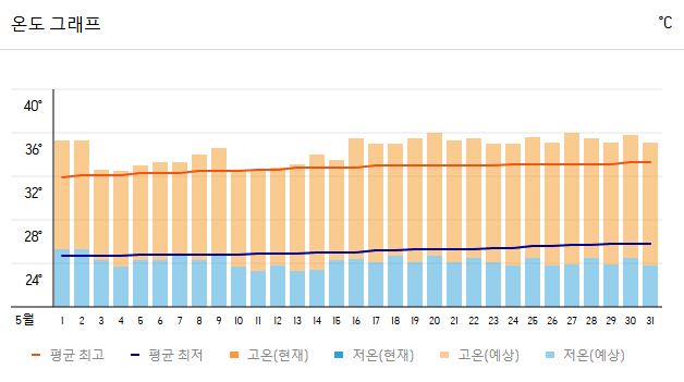 다낭 5월 평균 기온은 약 29℃로, 초여름다운 따뜻한 날씨가 이어집니다. 낮 최고 기온은 34~35℃, 밤 최저 기온은 26~27℃로 유지되며, 전반적으로 더운 날씨입니다.
