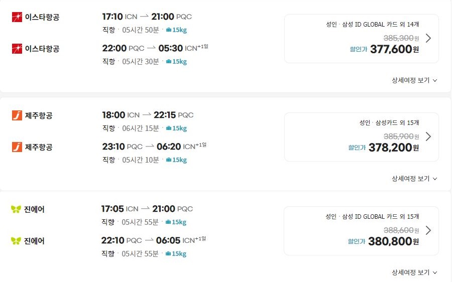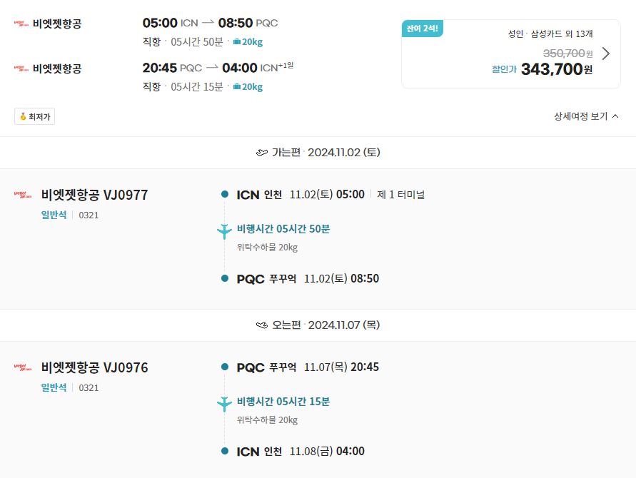 11월에는 인천에서 푸꾸옥까지의 직항 항공편이 여러 항공사에서 제공되며, 항공권 가격은 시기와 예약 시점에 따라 다릅니다. 2024년 11월 기준으로 최저가 항공권은 약 30만 원에서 40만 원 사이로 확인되며, 사전 예약을 통해 더욱 저렴한 가격으로 항공권을 구입할 수 있습니다. 비엣젯 항공이나 제주항공, 진에어, 이스타항공 과 같은 저가 항공사를 이용하면 더 저렴한 요금으로 푸꾸옥 여행을 계획할 수 있습니다. 특히, 11월 중순 이후로는 비수기 요금 혜택을 받을 수 있어 항공권 예약 시기를 잘 조절하는 것이 중요합니다.