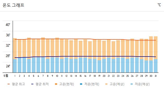 5월 보홀의 평균 기온은 약 29~30℃로, 낮 최고 기온은 32~34℃, 밤 최저 기온은 약 25~27℃입니다. 하루 종일 여름처럼 따뜻하고 습한 기후가 유지되어 반팔, 반바지 등의 가벼운 복장이 적합합니다.