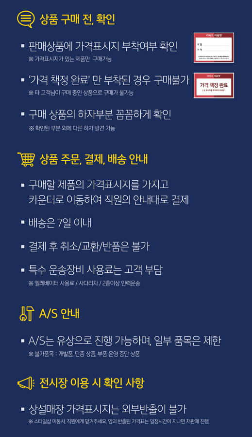 - 원하는 제품의 가격표가 있으면 가격표를 챙겨야 구매가 가능합니다. (가격표 없는 제품은 구매 불가)