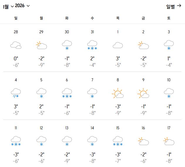 | 낮 최고 기온 | -1℃ ~ -3℃ |