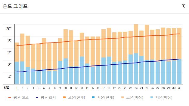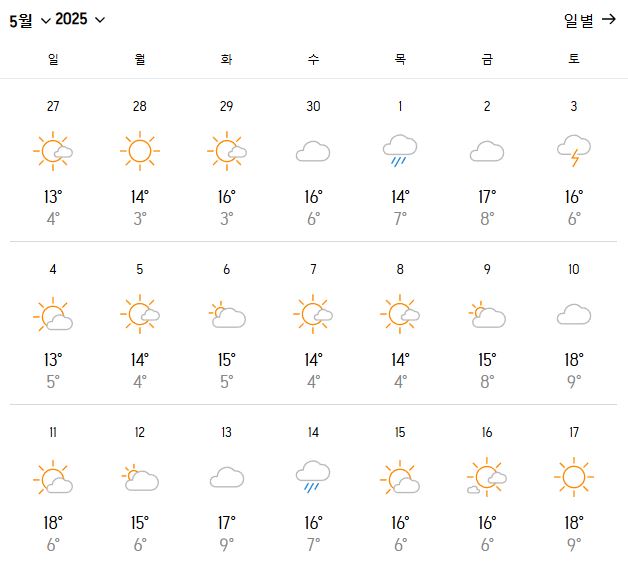 5월 중순 이후로 갈수록 기온이 점점 오르며 초여름의 느낌이 들기 시작합니다. 하지만 일교차가 크기 때문에 아침과 저녁 산책 시에는 가벼운 재킷이나 니트를 준비하는 것이 좋습니다.