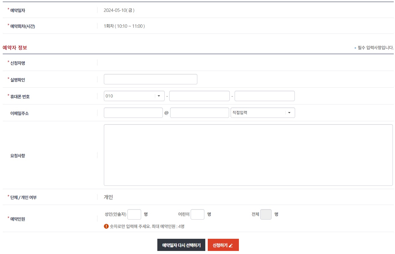 필요한 연락처와 예약인원을 작성하시면 예약완료됩니다.