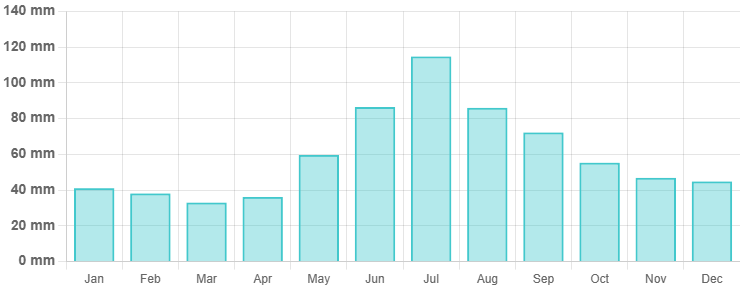 8월 평균 강수량은 약 50~60mm로, 비 오는 날은 평균 8~10일 정도입니다. 비는 주로 이른 아침이나 밤에 짧게 내리는 형태이며, 하루 종일 비가 오는 날은 드뭅니다.