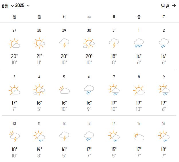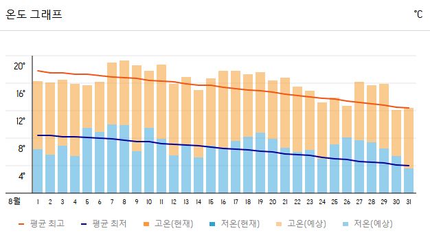 8월 평균 기온은 낮 13~17℃, 밤 6~10℃ 수준으로, 한국의 가을 같은 날씨입니다. 낮에는 햇볕 덕분에 따뜻하게 느껴질 수 있지만, 아침과 밤에는 체온 유지를 위한 겉옷이 꼭 필요합니다.