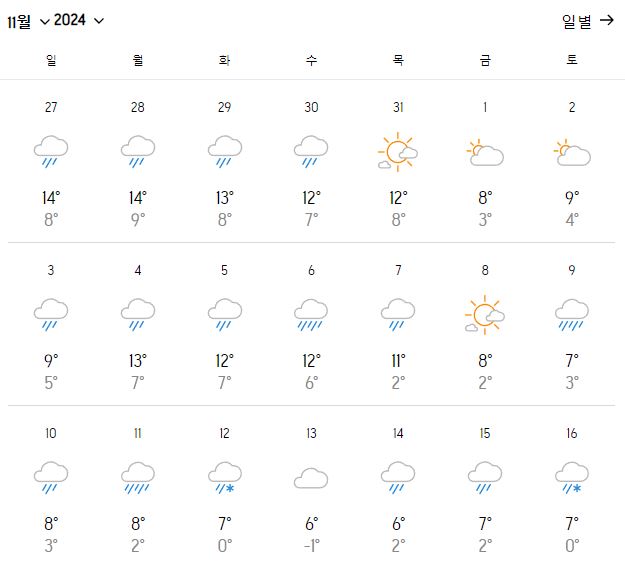 특히 11월의 첫 번째 주에는 맑은 날이 자주 나타나며, 이 시점에서 자연의 아름다움을 최대한 즐길 수 있습니다. 그러나 11월이 진행됨에 따라 날씨는 점점 흐려지고 비가 내리는 날이 증가할 수 있으니, 여행 계획을 세울 때 이를 염두에 두는 것이 중요합니다.