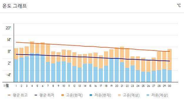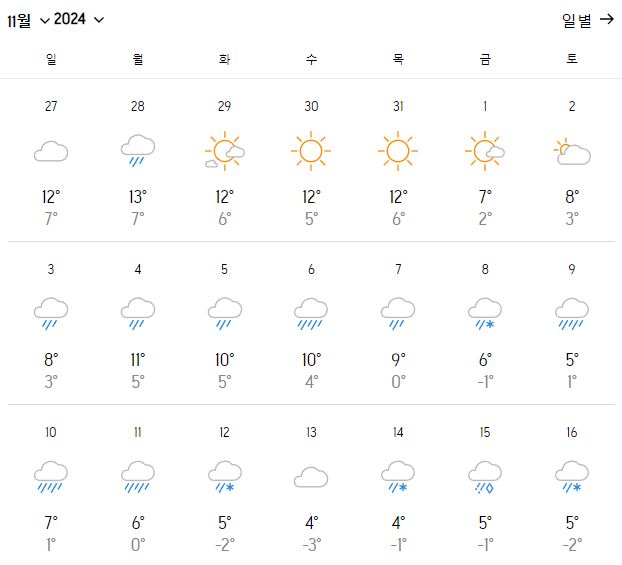 11월은 융프라우(그린델발트) 가 서서히 겨울로 접어드는 시기로, 기온 변화가 뚜렷합니다. 평균 기온은 약 -2°C에서 5°C 사이로, 낮 동안에는 5°C까지 올라가고 밤에는 -2°C까지 떨어질 수 있습니다. 최고 기온은 7°C에 도달할 수 있으나, 저온은 -5°C까지 내려가는 경우도 있어, 아침과 저녁에는 추운 날씨를 보입니다.