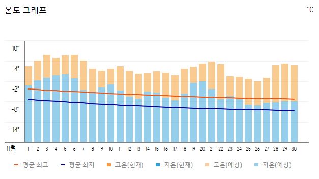 11월 체르마트 날씨의 평균 기온은 0도에서 6도 정도로 낮아지며, 본격적인 겨울로 진입하는 시기입니다. 11월의 최고 기온은 약 6도까지 오를 수 있지만, 아침과 저녁에는 영하로 내려갈 수 있어 매우 추운 편입니다. 낮 동안은 그나마 외출하기 좋은 기온이지만, 해가 진 이후에는 급격히 추워지므로 따뜻한 옷차림이 필수적입니다.