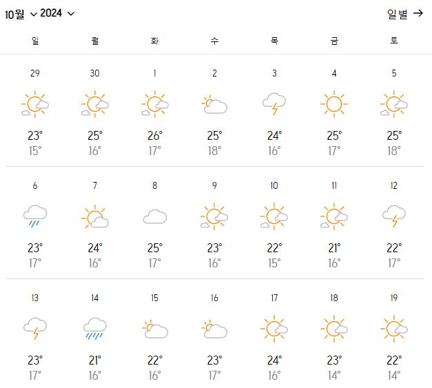 최고 기온은 약 23°C까지 오를 수 있으며, 한낮에는 따뜻한 햇살을 즐기며 야외에서 시간을 보내기 좋습니다. 반면, 최저 기온은 13°C로 내려가 쌀쌀한 날씨를 경험할 수 있으니, 저녁 시간대의 여행을 계획할 때는 적절한 옷차림을 준비해야 합니다.