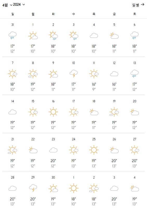 4월 내내 바르셀로나는 점진적이지만 눈에 띄는 기온 변화를 겪습니다. 월초에는 낮 기온이 섭씨 15-18도를 맴돌며 밤 기온은 약간 낮아집니다. 달이 진행됨에 따라 수은은 꾸준히 상승하여 4월 말에는 평균 최고 섭씨 18도를 넘는 경우도 종종 발생합니다.