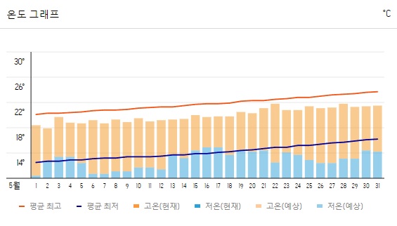 5월은 이전 달에 비해 강수량이 크게 감소하여 바르셀로나의 건조한 날씨가 시작되었음을 알립니다. 스페인 평균강수량은 4월부터 7월까지 점차 줄어드는 양상을 보이며, 8월부터는 급격하게 증가합니다. 평균적으로 바르셀로나에는 5월에 걸쳐 약 30-40mm의 강수량이 쏟아지나 큰 양은 아니라 맑은 날씨 기대하셔도 좋을것 같습니다.