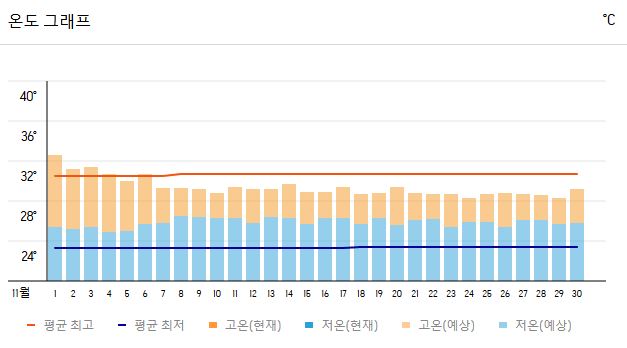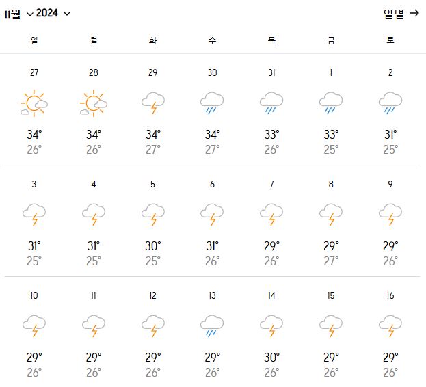11월의 싱가포르 날씨는 평균 기온이 26℃~31℃로, 상대적으로 덥고 습한 편입니다. 특히 낮에는 기온이 최고 33℃까지 오를 수 있으나, 밤에는 24℃ 정도로 떨어져 다소 쌀쌀할 수 있습니다.