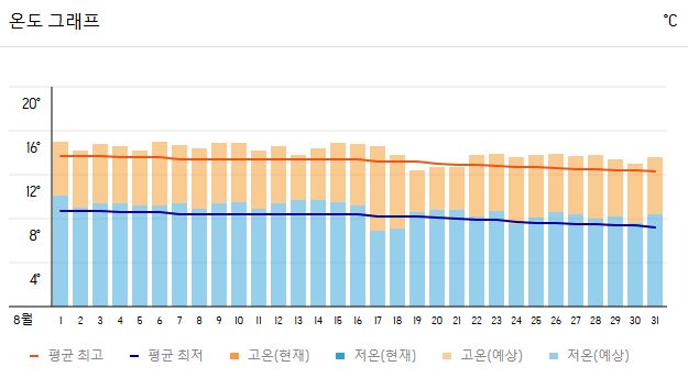 8월 평균 강수량은 약 50~80mm 수준이며, 평균 비 오는 날은 12~16일 정도입니다. 비는 가벼운 이슬비 또는 짧은 소나기 형태가 많아 방수 재킷이 매우 유용합니다.