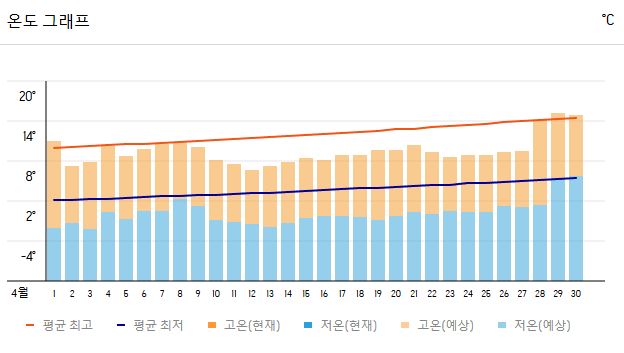 4월은 겨울이 끝나가는 시기로, 비 또는 눈이 내리는 날이 간헐적으로 있습니다.