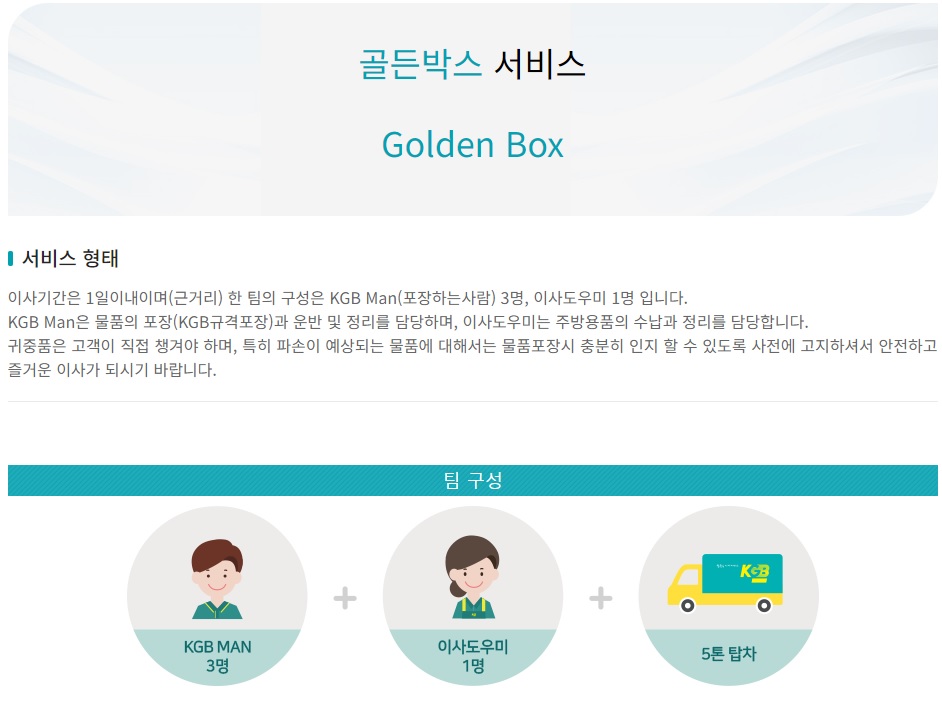 골든박스 : KGB MAN 3명 + 이사 도우미 1명 + 5톤 탑차 (흔히 우리가 아는 이사당일 포장이사하는 서비스입니다.)