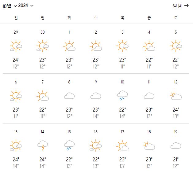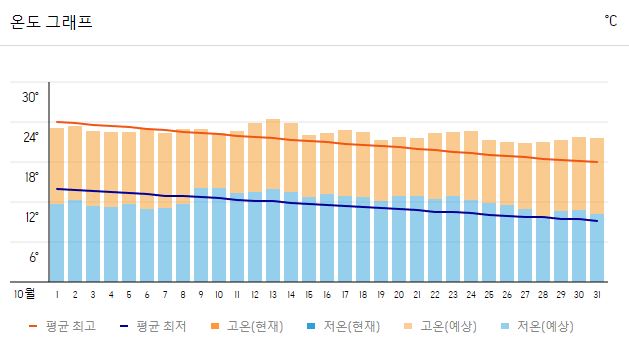 10월 초에는 낮 최고 기온이 23°C에서 25°C까지 오르며, 다소 따뜻한 날씨를 느낄 수 있습니다. 하지만 아침과 저녁에는 기온이 급격히 내려가면서 최저 기온이 10°C까지 떨어질 수 있습니다. 이로 인해 체온 조절에 신경 써야 하므로, 낮에는 가볍게 입더라도 저녁에는 추위를 막을 수 있는 옷을 준비하는 것이 좋습니다.