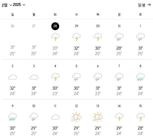2월의 덴파사르 발리는 평균 기온이 27°C로, 비교적 따뜻한 날씨가 이어집니다. 낮 기온은 최대 31°C까지 올라가며, 밤에는 최저 24°C까지 떨어집니다. 습도가 높은 편이므로 가벼운 옷차림을 추천하며, 야외 활동 시 자외선 차단제와 충분한 수분 섭취가 필요합니다.