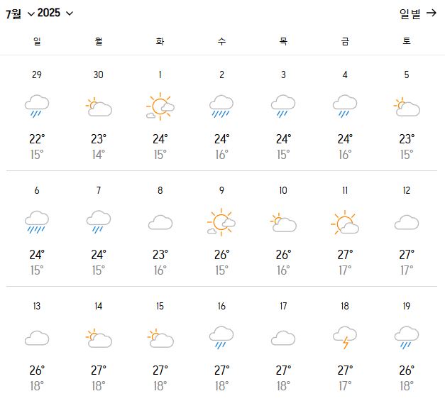 7월의 후라노는 전체 31일 중 약 14~16일은 완전히 맑은 날, 약 8~10일은 부분적으로 맑은 날씨가 나타납니다. 특히 7월 중순~하순은 라벤더 만개 시기와 겹쳐 맑고 청명한 하늘과 보랏빛 라벤더밭을 감상하기에 최적입니다.