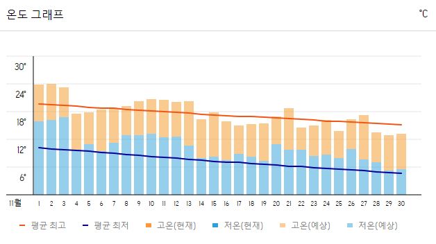 11월 초와 중순에는 비교적 따뜻한 날씨가 계속되지만, 하순으로 접어들면 기온이 점점 더 낮아집니다. 특히 아침 일찍이나 저녁 늦게는 두꺼운 외투가 필요할 정도로 추워질 수 있으니, 야외 활동 시에는 옷차림에 신경 쓰는 것이 좋습니다.