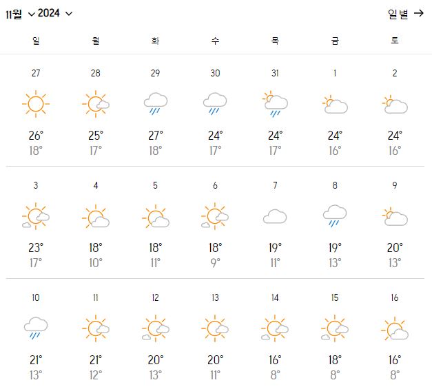 11월 오사카 날씨는 중순까지 맑은 날이 주를 이루며, 말일로 갈수록 흐리거나 비가 오는 경우가 늘어납니다. 따라서 여행 일정을 세울 때, 특히 야외에서 긴 시간을 보낼 계획이 있다면 이러한 날씨 변화를 고려하는 것이 좋습니다. 매년 날씨가 다를 수 있으니 출발 전 현지 날씨를 확인하는 것도 잊지 마세요.
