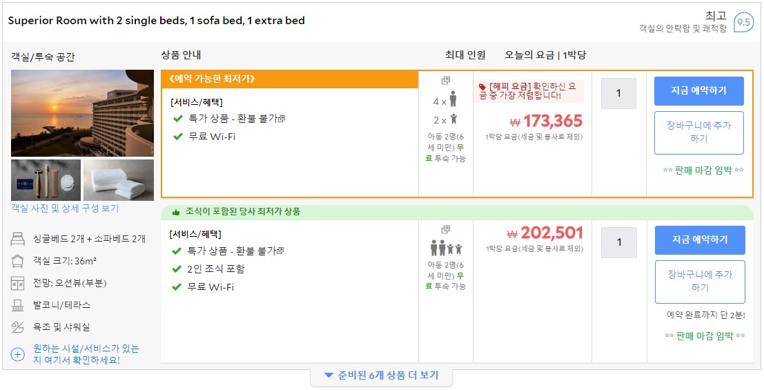 - 기본룸 2 싱글베드, 1 엑스트라베드, 1 소파베드 (성인 4명 + 아이 2명까지 투숙 가능)