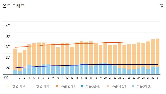 7월의 평균 강수량은 약 130~170mm로, 여름철 강수량이 집중되는 시기 중 하나입니다. 평균 비 오는 날은 10~12일 정도이며 대부분 짧고 강한 국지성 소나기 형태로 나타납니다.