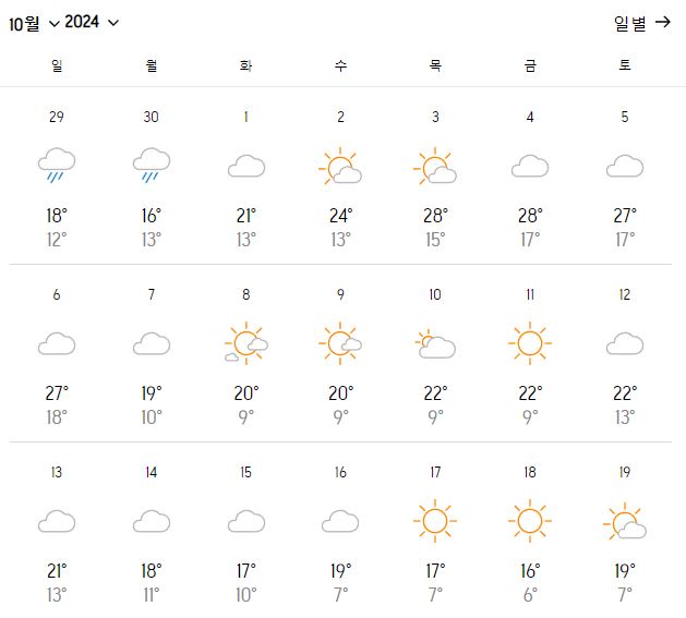 10월의 평균 기온은 약 15°C로, 낮에는 따뜻하고 밤에는 선선한 편입니다. 이 시기 동안의 최고 기온은 약 20~25°C에 이르며, 특히 낮 시간 동안에는 활동하기에 매우 쾌적한 기온입니다. 반면, 최저 기온은 5°C에서 10°C 사이로 떨어질 수 있어, 아침이나 저녁 시간에는 따뜻한 옷을 입는 것이 좋습니다.