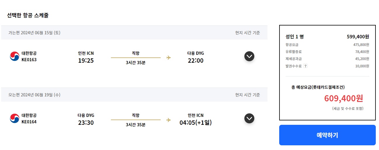 장가계 6월 직항 항공권의 경우 성인기준 약 60만 원대 수준으로 최저가가 61만 원으로 보입니다.