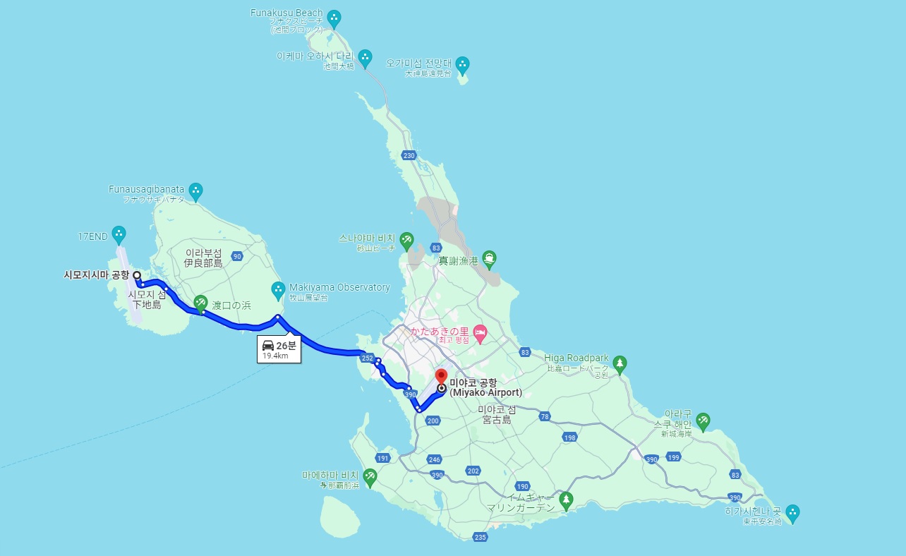 다들 많이들 가시는 미야코섬에 미야코 공항은 있지만, 국내선 전용이고 진에어에서 취항한 공항은 시모지시마 공항으로 바로 옆에 있는 섬입니다. 다만, 차로 이동시 미야코 섬까지 20~30분정도면 이동이 가능해서 미야코 섬내에 숙박하는 경우 크게 부담이 없다는게 장점입니다. 직항이 없었을땐 일본내에서 국내선을 타고 이동해야해서 불편함이 있었죠.