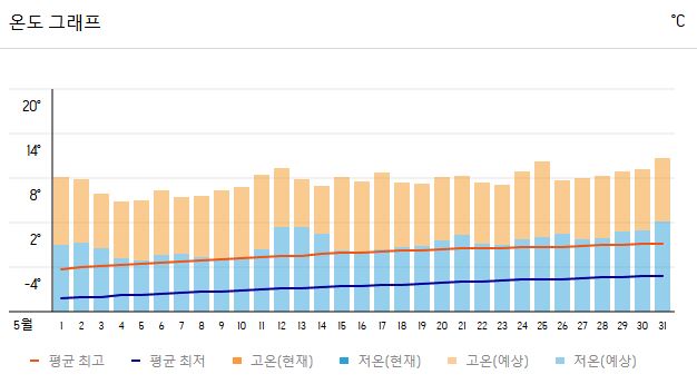 인터라켄 5월 평균 기온은 10~16℃입니다. 낮 최고 기온은 18~21℃, 밤 최저 기온은 7~10℃로 비교적 쌀쌀할 수 있으니 보