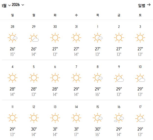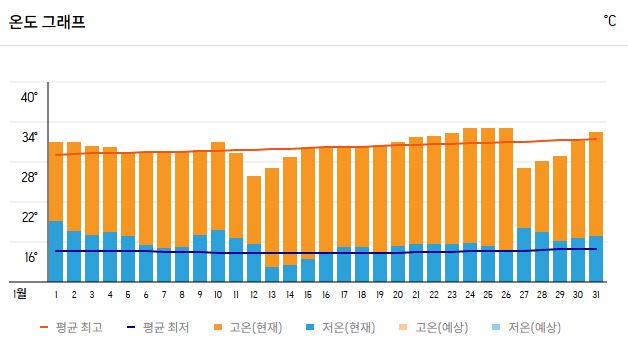 | 평균 낮 최고 | 28~30℃ |