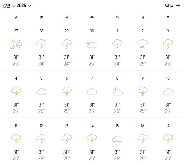 코타키나발루의 5월은 건기와 우기의 경계 시기로, 약 15~18일 정도 맑은 날 또는 부분적으로 흐린 날이 예상됩니다. 대체로 오전 시간대는 쾌청한 날씨가 이어지며, 오후에는 간헐적으로 소나기가 내릴 수 있습니다.
