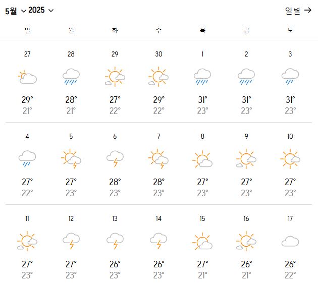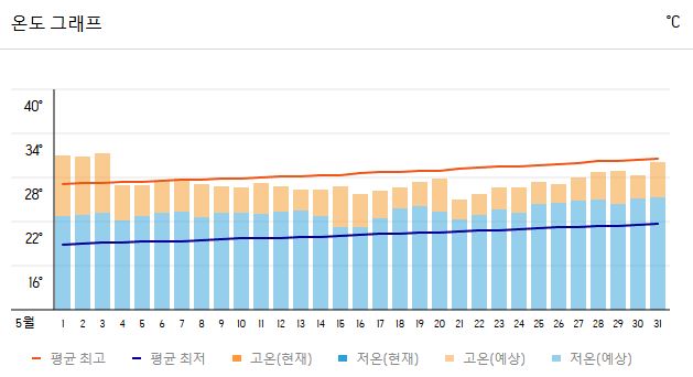 최고 기온은 29~31℃, 최저 기온은 21~23℃ 정도로, 이른 여름 기운이 느껴지기 시작하는 시기입니다.