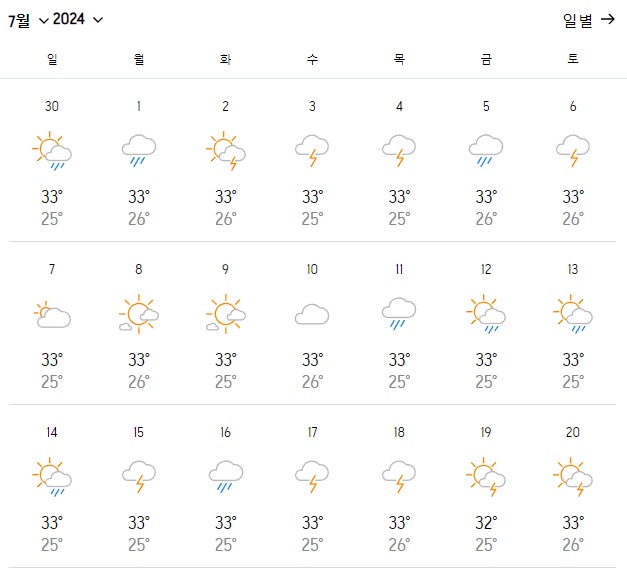 방콕의 7월 날씨는 흐린 하늘, 간헐적인 소나기, 그리고 열대성 폭우 속에 가끔 맑은 날이 섞여 있는 것이 특징입니다. 보통 한 달의 대부분 동안 흐린 상태를 경험하는 것이 일반적이지만, 올해 7월은 약 15일 정도의 맑은 날을 기대할 수 있습니다.