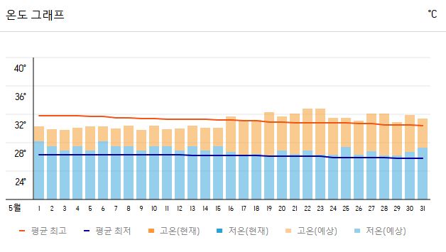 5월은 우기의 시작으로, 월 평균 강수량은 약 180~200mm 수준입니다. 하지만 대부분은 오후에 갑작스럽게 내리는 스콜성 소나기 형태로, 몇십 분 내에 멈추고 하늘이 다시 맑아지는 경우가 많습니다.