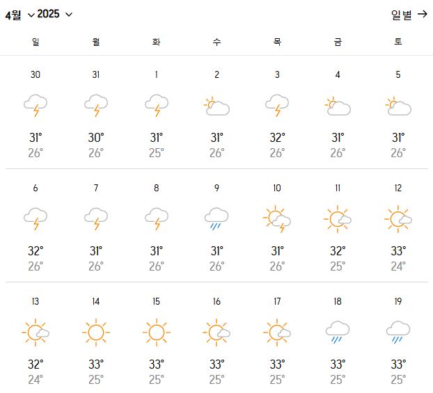 • 최고 기온: **32~34°C** (한낮에는 무더위)