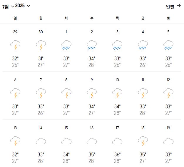 | 일 최저 기온 | 25℃ 내외 |