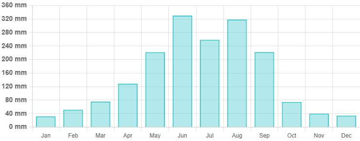 7월은 연간 두 번째로 비가 많이 오는 달로, 평균 강수량은 약 300~350mm입니다. 주로 짧고 강한 소나기, 간헐적인 스콜 형태이며, 폭우가 며칠씩 지속되는 경우는 많지 않습니다.