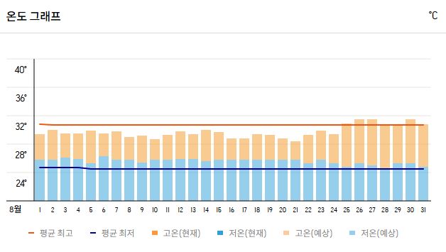 8월의 괌은 한 달 평균 360~400mm의 강수량을 기록하며, 약 20일 가까이 비가 내립니다. 대부분 갑작스러운 스콜 형태이며, 일조 시간은 평균 5~8시간입니다.