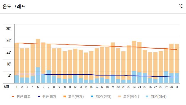 8월의 강수량은 146–206 mm로 높으며, 비 오는 날이 월 평균 12–17일 정도입니다. 일조 총 시간은 약 158시간으로, 하루 평균 5–6시간 쾌적한 햇살을 기대할 수 있습니다.
