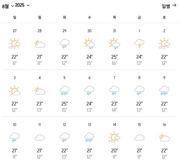 - 특이사항: 비 예보 시에도 맑은 순간이 많으며, 안개나 직사광선이 동시에 나타나기도 합니다.